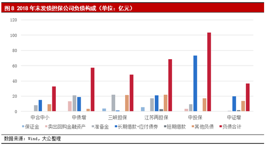 截至2018年末,6家发债担保公司的负债以担保业务准备金和长期借款为主。其中,江苏再担保和中证增的短期借款占比分别为4.63%和4.11%,其他发债担保公司均无短期借款。同时在资产分级管理制度的实施和推动下,担保公司资产结构将进一步调整为以流动性较高的Ⅰ级资产和Ⅱ级资产为主。整体来看,发债担保公司的表内债务流动性风险整体可控。