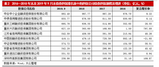 根据我国债券担保规模排名前十的担保机构来看,截至2019年9月末,中债信用增进投资股份有限公司、重庆进出口融资担保有限公司以及中合中小企业融资担保股份有限公司债券担保余额增速总体较为平稳,而重庆兴农融资担保集团有限公司和深圳市高新投集团有限公司债券担保余额增速最快,复合增长率分别达到797.80%和109.87%,其他机构债券担保余额规模增速处于28.03%~45.42%之间。同时,因担保业务结构调整和新增担保规模较小所致,中国投融资担保股份有限公司债券担保余额持续下降。预计2020年,受限于融资担保放大倍数、单笔担保业务集中度等监管要求,部分前期发展激进的大中担保机构债券担保业务增速将继续放缓,其他信用资质良好、业务拓展空间较大的担保公司或将成为债券担保市场的主力军。