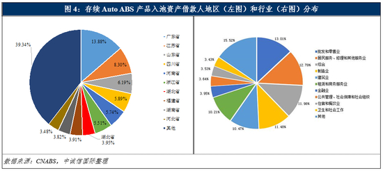 从区域分散度来看,存续Auto ABS产品的基础资产分布于全国各地区,区域分散度相对较好,单一地区经济变动对产品影响有限。