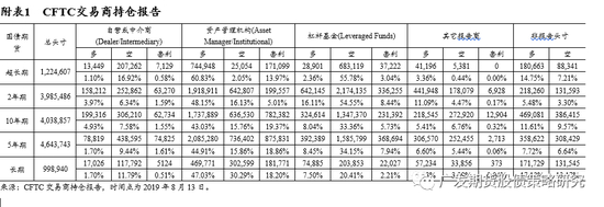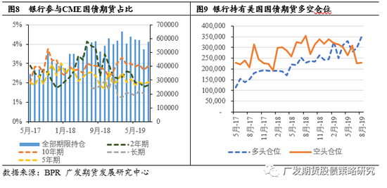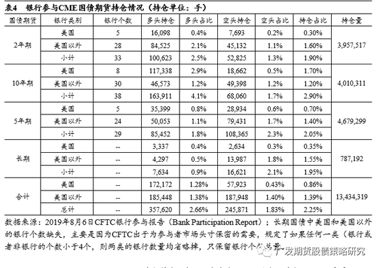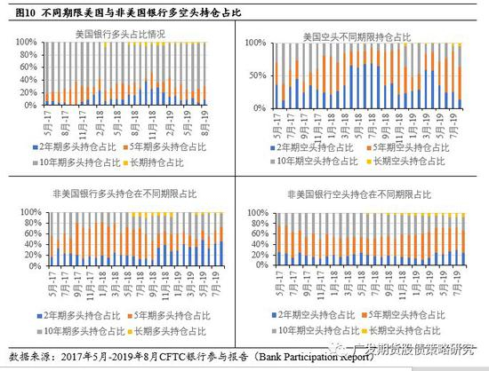 不过,如果将银行持仓,分为美国和非美国银行来看,两者还是存在较大的差异性。先以2019年8月份的报告来看(见表4),首先,美国以外的银行参与国债期货的深度要高于美国银行。美国以外银行无论是在数量还是在持仓比例上都要高于美国银行,无论是两年、五年还是10年期国债期货,非美国银行参与个数都远高于美国银行;非美国银行的持仓占比1.39%也高于美国银行的0.86%。其次,从多空方向上来看,非美国银行目前在空头上的仓位要远高于美国,在多头上的仓位基本相当,这可能显示两者在策略上的差异性。