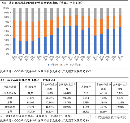 从持有利率衍生品持有集中度看(参见表2和附表2),利率衍生品主要被前4大银行持有,集中度较高。虽没有具体的利率衍生品集中度数据,主要是从美国4大银行持有的衍生品数量占全部银行持有量的88.32%推断的。其中,截止到2019年第一季度,前4大银行持有的期货/远期占全部银行的80.96%,互换占比88.74%,期权占比94.43%,信用衍生品占比94.64%。