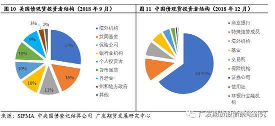 美国银行之所以在国债期货中持仓较小,一方面与其可以选择的对冲工具较多有关,另一方面与美国国债现货的持有结构有关。从图9中可以看出,截止到2018年三季度,美国国债现货绝大多数由境外投资者以及共同基金持有,两者共占国债持有量的43%,银行和保险公司占比仅分别为10%和11%,这也是影响其使用国债期货的一个原因之一。