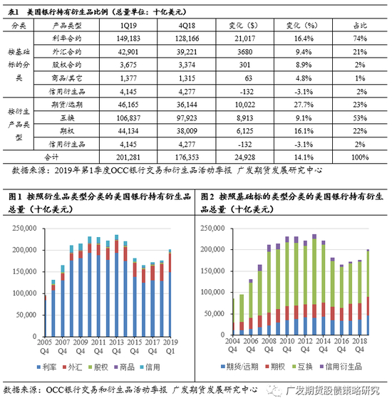 在BTDA报告中,OCC统计银行持有的衍生品口径主要分为两类,一是以基础种类划分,例如利率、外汇、商品、信用和股权等;二是以衍生品类型划分,如期货/远期、互换、期权和信用衍生品等。对于银行的类别,OCC将被保险的美国商业银行和储蓄机构(Insured U.S. Commercial Banks and Saving Association)为主的机构均归属为银行,截止到2019年1季度,归属于该类的银行近1318余家。该报告按照季度统计。