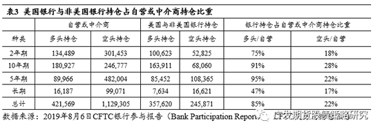 不过,需要说明的是,COT报告中的自营或中间商的分类不仅仅包括银行,还有证券、互换和其他衍生品经纪商等机构,其持仓情况并不完全代表银行。以2019年8月6日的持仓数据为例,美国与非美国银行持仓占自营或中介商比重(见表3)来看,银行在自营或中介商全部国债期货品种中多头持仓35.76万手,占全部自营或中介商多头持仓的85%,空头持仓24.59万手,占全部自行或中介商空头持仓的22%,银行多头持仓高于空头。可以看出,银行与其他自营或中间商的策略和方向存在一定差别。