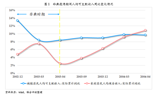 参考非典疫情,非典疫情发生于2002年12月15日,疫情在2003年2月开始扩散加速,4~5月为疫情高峰,于2003年7月中旬基本结束,历时7个月。从非典疫情期间人均可支配收入变化情况来看,城镇居民人均可支配收入同比增速自2003年一季度起下滑至8.4%,后续趋于平稳;农村居民人均现金收入同比增速在一季度仍呈上升态势,二季度迅速下滑至2.5%,疫情结束后逐渐恢复。