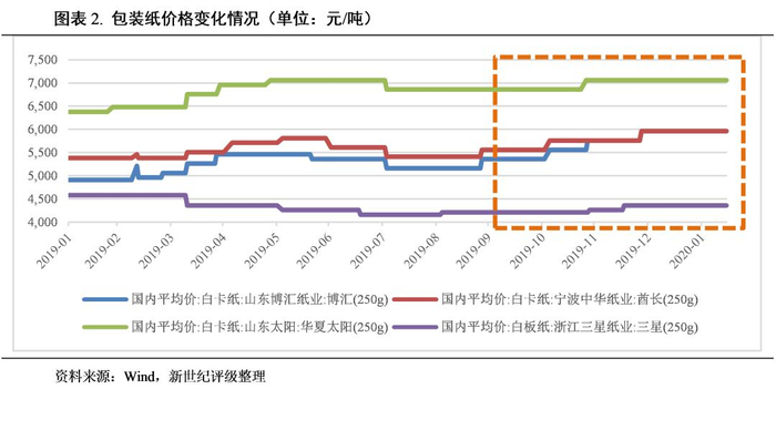 由于疫情期间交通运输受限、原材料供应限制、造纸厂整体复工延迟等因素,行业供给量短期内面临下滑。需求方面,2019年第四季度主要包装纸及文化纸价格多次上涨,下游纸板厂倾向于判断纸价增长空间减小,因此原纸库存数量相对较低,开工后存在补库存需求。此外随着下游制造业的逐渐复工以及赶工要求,需求端也将进一步发力。上述供需因素影响下,纸价或存在上涨空间,但是同样由于道路运输、下游复工至常态尚需一定时间,纸企前期库存积压有待消化,因此纸价上涨空间有限。疫情结束之后,随着供需逐渐恢复,考虑到2019年第四季度及疫情期间纸价已连续经历一段时间上涨,预计进一步上涨的空间有限。