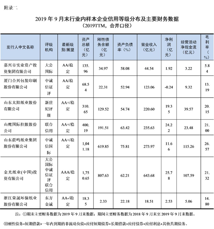 财务数据方面,我们对发债企业进行筛选并对样本企业环比数据进行分析。样本选取过程中对于母子公司均发债的,剔除子公司保留母公司、或保留造纸收入占比更高的主体、剔除未公布三季报的企业等原则下,挑选了7家发债主体(详见附录二)。2019年9月末,样本企业综合负债率为65.00%,负债总额共计2770.64亿元,其中刚性债务占负债总额的74.66%,刚性债务规模超过600亿元的2家,分别是金光纸业和晨鸣纸业,100-200亿元的2家,50亿元以下的2家、10亿元以下的1家,刚性债务主要集中在龙头企业。2018Q4-2019Q3,造纸样本企业合计取得营业收入1550.98亿元,同比基本持平,优于同期行业营收下降的现象;营业成本1227.34亿元,同比增长5.53%,涨幅整体小于样本企业;同期毛利率同比下滑3.98个百分点,综合作用下,样本企业盈利虽有下滑但优于行业整体状况。从现金回笼情况看,2018Q4-2019Q3样本企业营业收入现金率有所改善,7家样本企业中,营业收入现金率大于100%的4家,剩余3家均介于90-100%。总体看,在行业景气度下行时期,造纸样本企业虽受到一定影响,但其表现优于行业整体情况。