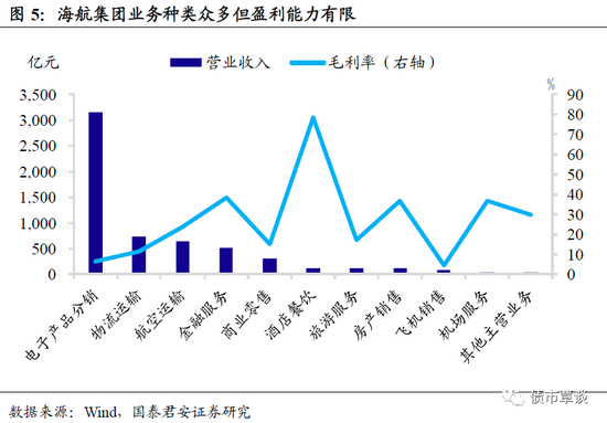 激进扩张下海航多元化业务对利润贡献有限,复杂的股权结构反而给公司管理造成困难。海航集团自2015年起采用激进的扩张策略,2017年末总资产规模达到峰值1.23万亿元,是2015年末总资产的2.63倍。从行业分布看,除主营的航空业务外,还涉及物流、金融、酒店、旅游、地产等;截至2018年底,海航共涉及44个细分行业,横跨航空、金融、科技、资本、能源、零售、旅游等多个大行业,多元化经营野心勃勃。但扩张结果事与愿违。一方面,毛利率水平不尽人意,在海航集团2017年资产鼎盛时期,其电子产品分销占营业收入比重高达53.68%,但毛利率不到7%,导致公司整体盈利水平有限。另一方面,海航盘错交结的股权结构和复杂的企业架构,一定程度上影响公司治理和业务开展,进而导致公司无法对多元业务进行有效的协同管理。