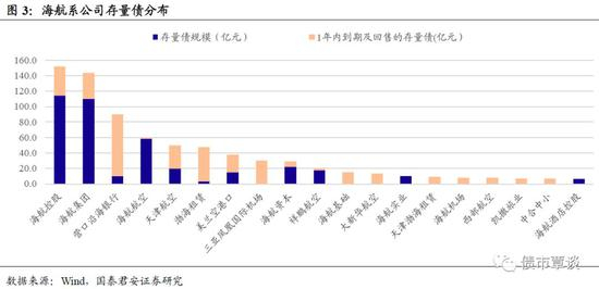 截至2020年3月2日,海航系企业存量债有121只(包括51只同业存单和1只商业银行二级债),存量债规模共计742.8亿万,1年后到期及回售的存量债为355.8亿元,占比47.89%。其中,海南航空控股和海航集团存量债规模居于前两位,分别为151.9亿元和144.0亿元。就企业主体评级来看,在19家发行债券的企业中,AAA级有7家,AA+级有4家,AA级有6家,AA-级有1家,BBB级有1家。