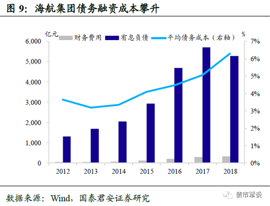 融资环境不利,海航内忧外患。2017年海外投资及资金出境监管趋严,海航相关贷款中断,不得不用国内运营资金拆东墙补西墙。与此同时,在国内去杠杆的大背景下,海航融资难度和融资成本不断攀升。用财务费用/有息负债衡量债务成本可以看出,从2014-2018年海航集团平均债务成本从3.34%一路攀升至6.31%,其中2018年的财务费用高达332.62亿元,而同期利润总额仅为5.87亿元。融资成本高企使海航集团的债务负担越发沉重,而不利的融资环境更使集团深陷流动性危机的泥淖。
