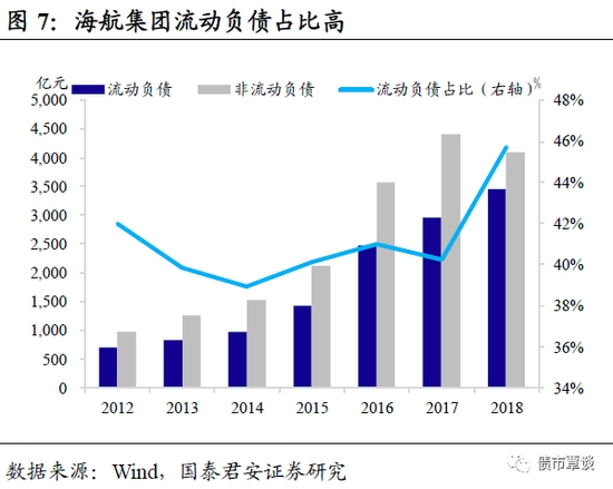 流动性负债占比高,面临较大的债务到期压力。海航大举并购伴随着债务的扩张。2015-2018年海航的资产负债率分别为67.48%、59.12%、52.65%、55.11%,流动负债占比40%以上,面临较大的债务压力。海航债务缠身的同时也深陷诉讼风波中:因与厦门国际信托的合同纠纷,海航集团、海航实业价值9900万元的财产受限;因与国泰租赁的合同纠纷,海航集团及其关联方在海航控股的3.53%和24.28%的股权被全部冻结;海航资本也因合同纠纷被司法冻结所持有的海航投资股份的54.37%。