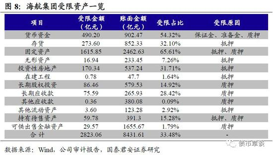 海航资产受限资产占比高,影响企业融资和经营活动。值得注意的是,截至2018年底,海航资产规模虽达到1.07万亿元,但资产受限占比很高,其中货币资金受限占比达54.32%,受限部分无法用以满足流动性需求。受限原因除司法冻结之外,还涉及抵押质押贷款及存放于银行的法定准备金。资产冻结一方面容易使企业失去资本市场的支持,提高融资难度,另一方面也可能波及业务经营。