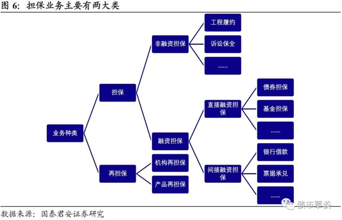 从业务种类看,可以分为担保(融资担保和非融资担保)、再担保两大类。