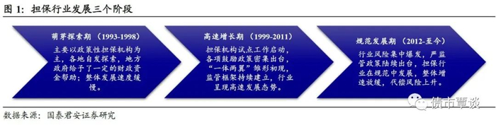 担保作为一种重要的信用增进方式,有利于促进资金融通和商品流通。我国担保行业(主要以融资担保业务为主,所以也称“融资担保行业”)发展,根据行业监管主体和政策演变,发展速度及业务开展情况,可分为三个阶段:萌探索展期(1993-1998)、高速增长期(1999 -2011)、规范发展期(2012年至今)。