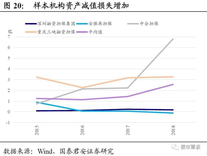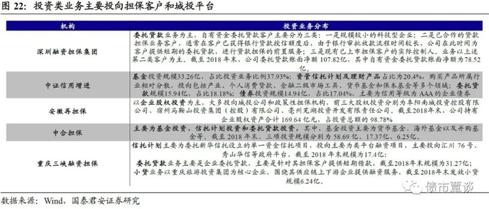 投资类业务资金投向与担保业务在客户选择上有一定重合,城投平台类投资较多,宏观经济下行增加了这些业务资产端风险。例如深圳融资担保集团投资类业务主要是委托贷款业务,而该业务主要客户是公司的贷款担保客户;重庆三峡融资担保的投资类业务以信托计划和委托贷款为主,主要投向政府融资平台和担保客户。考虑到担保客户整体信用资质比较弱,经济增速放缓背景下,受负面影响更多大;地方政府融资平台违约风险上升,可能带来投资类业务不良上升,针对该类业务计提的资产减值损失有所上升。