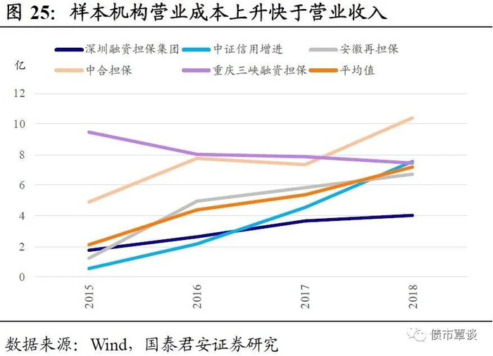 (2)营业成本看,受上述三因素影响,整体增长速度较快。样本机构营业成本整体上升较快,主要是由于对担保业务计提的担保准备金(期末未到期责任准备金+期末担保赔偿准备金+期末一般风险准备金)、担保和投资业务计提减值准备增加,加上担保代偿率的上升,这些都拉低了盈利水平,反映了担保行业面临的业务风险在上升。