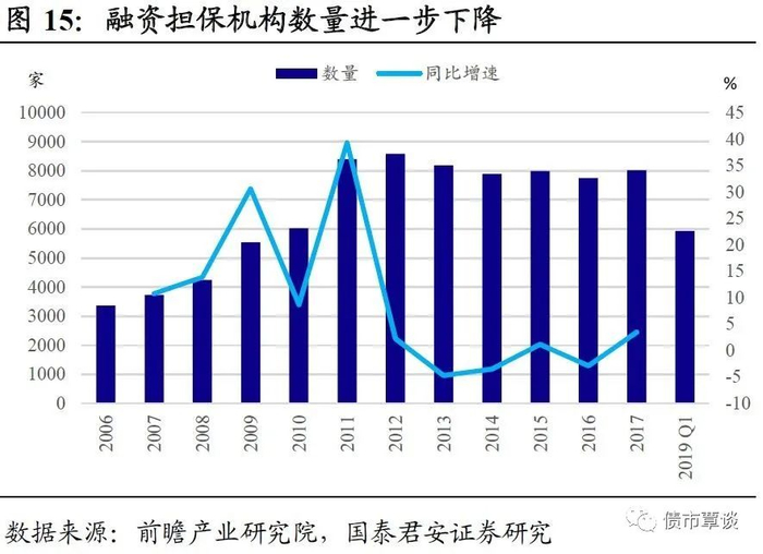 “减量”体现在,伴随担保业务规模增长放缓,机构数量由升转降。担保行业在保余额是衡量担保机构业务规模的重要指标,数据显示,融资担保机构在保余额已由2012年的1.9万亿增长到2017年的2.83万亿,至2019年第一季度达到2.3万亿,近几年增速有所下降; 担保机构数量增长由升转降,截至2019年一季度末,全国融资担保法人机构仅剩5937家,以此计算,较2012年高峰期8590家,下降31%。