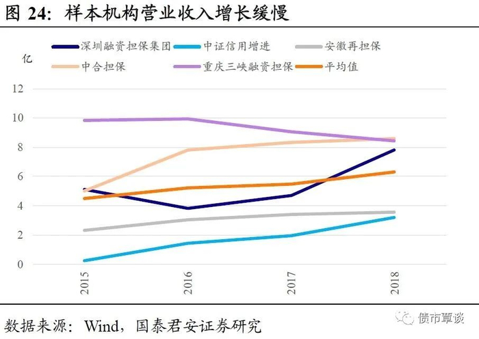 (5)宏观经济下行压力加大将带来担保机构业务的区域性和行业性融资担保风险提升,或冲击其盈利水平。经济下行阶段,防控风险是重点。行业发展情况看,融资担保机构多数是以省或市县为业务范围开展担保业务,需要注意区域性风险;此外,不少担保机构业务主要是政府融资平台类。在当前部分地区经济增速放缓,地方政府融资平台债务压力增大,违约风险暴露的背景下,可能带来担保机构的代偿风险上升,削弱盈利能力。