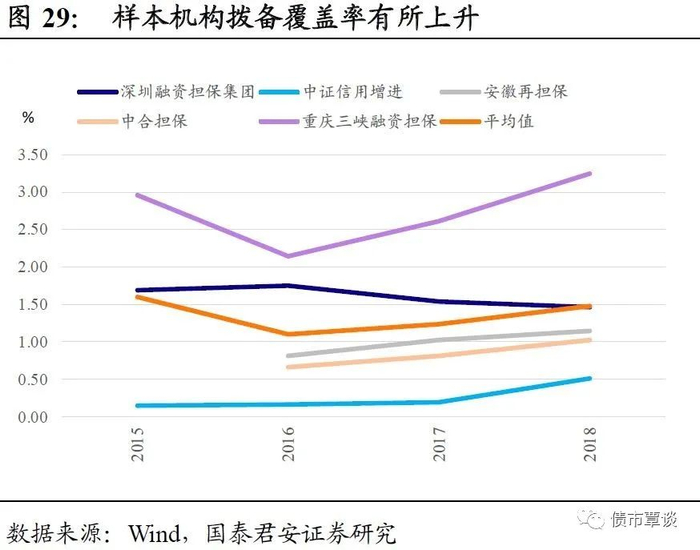 准备金拨备率较高的河南省中小企业担保集团股份有限公司,公开披露的数据截止到2018年6月,准备金覆盖率达32.11%。该公司2016和2017年的准备金覆盖率分别为43.83%和35.45%,这是由于该公司客户主要集中在本省内,受河南省经济增速放缓影响,该公司代偿余额近年不断上升,造成该比率持续下降。