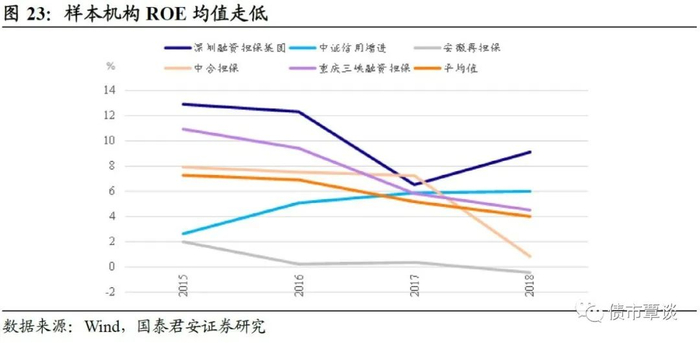 受上述因素影响,担保行业盈利能力整体有所下滑,内部分化更明显。国务院发展研究中心金融研究所2019年发布的一份报告显示,2017年全国融资担保机构的营业利润总体呈下降趋势,相关机构的平均净资产收益率(ROE)已低于1%。除了部分规模较大的融资担保机构,多数融资担保机构盈利能力较弱,处于微利或亏损状态,商业可持续性不足。样本机构看,平均ROE由2015年的7.28%下降至2018年4%。不过,行业内部看,部分大型商业化担保机构,凭借其专业业务能力和相对较高的费率、扩张业务规模仍有不错的盈利。