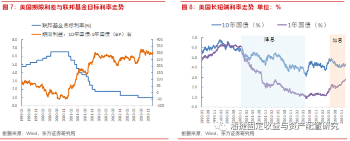 2000年6月经济开始回落,美联储不再加息,直至2001年1月3日,美联储开启降息周期,截至2003年6月降息周期结束,联邦基金目标利率从6.5%降至1%,累计下调550bp。