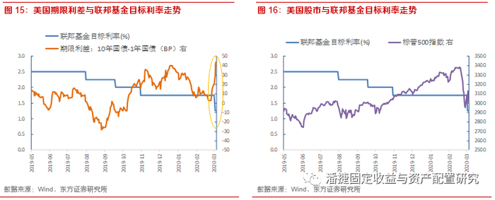 2019年8月至10月,美国连续3次降息,从2019年9月至12月,美国期限利差从-40bp扩大至40bp。2020年1月1日至2月24日,受新冠疫情影响,经济增速预期下降,且美联储并未进行进一步宽松,使得长端利率下行跟多,期限利差再次收窄至0左右。但3月3日,美联储提前宣布降息50bp,期限利差即重新扩大至40bp左右。