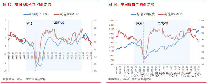 2009年1月,美国制造业PMI见底回升,股市也逐步企稳回升。2009年1月至8月,美国制造业PMI从33.1持续回升至53.5。股市从2009年4月开始见底回升,一直持续至2015年8月。