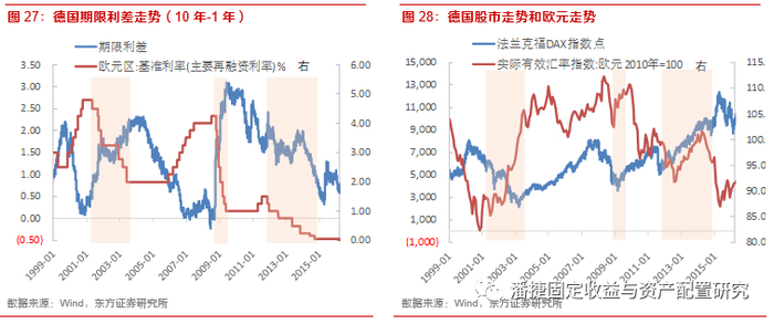 资产价格方面,股市持续上涨,DAX指数累计上涨71.25%左右。债券收益率持续下行,1年德债收益率下行72bp左右,10年德债收益率下行162bp左右,期限利差收窄90bp左右。汇率方面,欧元实际有效汇率指数下跌11.4%左右。