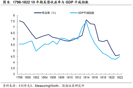 1802至1813年,美国受益于发生在欧洲的拿破仑战争,移民流入和农业增产较快,长期美债收益率(6%-6.5%左右)与长期GDP增速基本匹配。