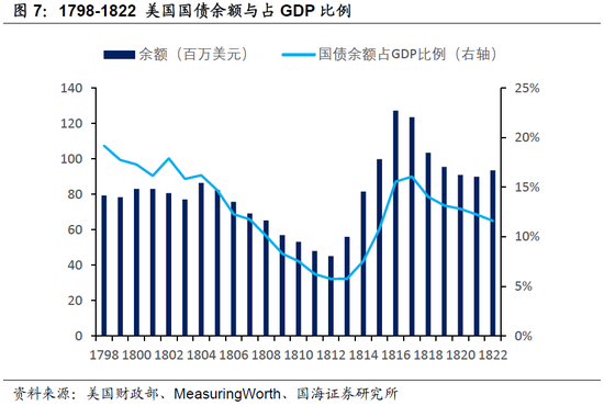 财政制度上,由于受贵金属本位、与“小政府”理念的约束,美国政府追求财政平衡或盈余,政府支出占GDP的比例常年维持在1%-2%之间。1804年至1812年间,由于财政盈余,政府债务余额连年下降。1813年至1816年,受战争赤字推动,政府债务再度上行。