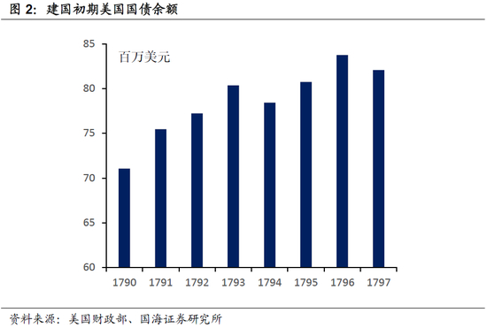 1789年,美国第一部《宪法》生效,联邦政府依据新《宪法》组建。新组建的联邦政府,承接了“大陆会议”及战时各州的积存债务。这些历史债务构成了第一批美国国债。