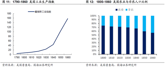 与此同时,美国追赶英国的脚步,引入第一次工业革命成果,开始发展以皮革、棉纺为主的初级轻工业,进一步推动了城市的发展。但是在1860年前,美国从事农业的人口占比虽有缩小,但依然超过50%,农业生产对经济的影响仍然重要。