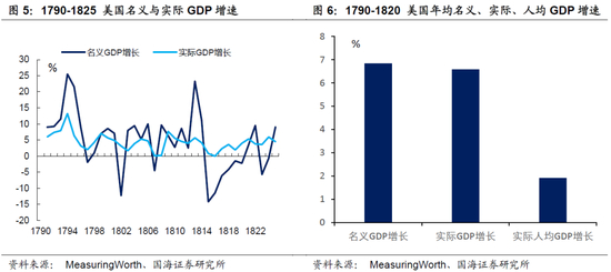 因为建国初期可开垦土地较多,加上欧洲移民和高生育率带来的人口增长,这一段时期美国经济增速维持在较高水平。1790-1820年,美国实际GDP年均增速可达6.6%,其中70%的增长由人口贡献。