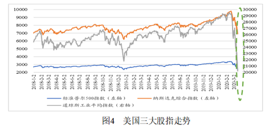 近期,多国股市剧烈震荡,表现出三方面特征。一是跌幅大。美股时隔23年再次触发熔断机制。2月20日至3月16日,道琼斯、纳斯达克、标普500分别下跌30.9%、29.2%、29.3%,美股已进入技术性熊市(图4)。欧洲股市亦全线跳水,2月20日至3月16日,德国DAX和法国CAC40均下跌36.0%。二是范围广。除美欧外,加拿大、巴西、韩国、泰国、巴基斯坦、印尼、菲律宾、墨西哥、哥伦比亚等多国股市也遭受重创,大幅下跌并触发熔断。三是难逆转。近期美联储超出市场预期,紧急降息、降准并推出量化宽松,均未能有效阻止美股下跌。