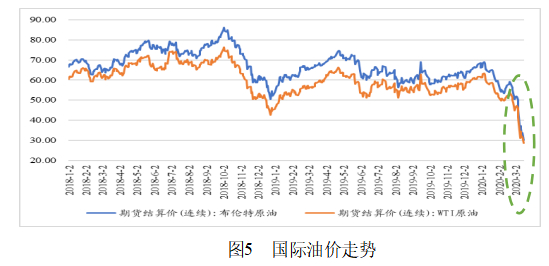 近期,国际原油市场受供需共同影响大幅下跌。2月20日至3月16日,国际布伦特原油期货从59.31美元/桶重挫近50%至30.05美元/桶,创2016年1月以来新低;WTI原油期货从53.88美元/桶大跌至28.70美元/桶,跌幅达47%,单日跌幅超过1991年1月海湾战争期间,刷新历史最高记录(图5)。