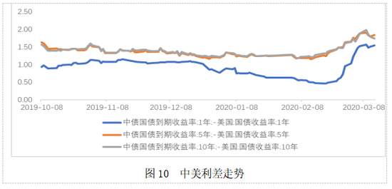 人民币汇率大幅贬值的风险不大,有望保持基本稳定。一是中国货币政策独立性增强,中美利差保持在高位。美联储超预期快速降息并扩大QE规模,而中国央行审慎放松货币政策,中美利差开始走阔,现在大幅高于100BP左右的舒适区间(图10)。二是无论海外疫情持续多久,中国都将是最早从疫情中恢复的经济体。中国疫情防控已接近尾声,生产生活秩序逐渐恢复正常,而海外疫情还处在发散阶段,确诊人数快速增加,停产停工才刚刚开始。三是中国是国际上少有的经济韧性较强的国家。经济体量大,内需强,回旋余地大,疫情短期冲击不改长期向好的基本面。这些因素都将对人民币汇率形成有力支持。