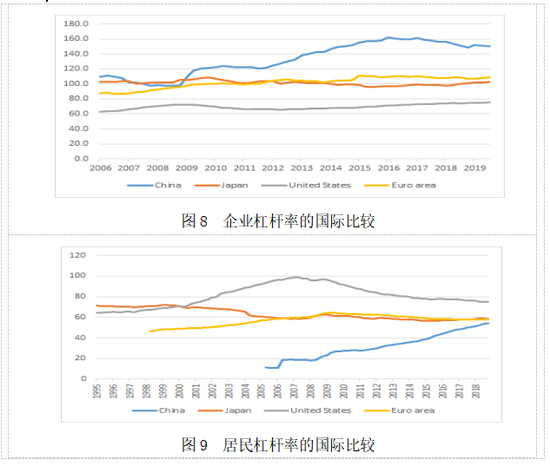 2017年以来,随着“三去一降一补”工作深入推进,我国非金融企业杠杆率稳步下降,但仍大幅高于国际水平(图8)。和政府、居民部门相比,非金融企业杠杆率风险对经济变化最为敏感。在当前国际国内形势动荡不安、经济生活秩序紊乱的背景下,非金融企业杠杆率风险应引起高度重视。