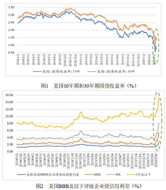 近期新冠肺炎疫情在全球迅速暴发,市场恐慌情绪升温,资金蜂拥避险资产,国债收益率大幅下跌,信用利差快速扩大。一是国债收益率大幅下跌。2月20日至3月16日,10年期美国国债收益率从1.52%跌至0.73%,跌幅近80BP,期间先后历史首次跌破1%和0.5%的关口,一度出现0.487%的历史最低报价;30年期美债收益率亦触及0.974%的历史低点,史上首次跌破1%关口(图1)。此外,英国、德国、澳大利亚等多国国债收益率亦大幅走低。二是高风险企业债信用利差快速扩大。3月13日,美国BBB、BB、B、CCC或以下企业债期权调整利差分别较2月20日大幅增加151BP、313BP、433BP和520BP,市场风险偏好明显降低(图2)。
