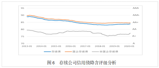 四是应重点关注信用风险。3月以来,受疫情影响,部分中小企业复产复工困难,信用风险有所抬头。2月违约债券28只,违约金额434.4亿,剔除北大方正,违约5只,违约金额79亿。而3月1日至18日,违约债券就有12只,违约金额131.41亿。2月存量公司信用债隐含评级整体下调,指数96.91,环比下降0.04%。其中,国企指数98.42,环比下降0.04%,非国企指数87.22,环比下降0.11%(图6)。隐含评级调整债券172支,其中下调142支。隐含评级调整涉及发行主体共28家,其中下调23家。