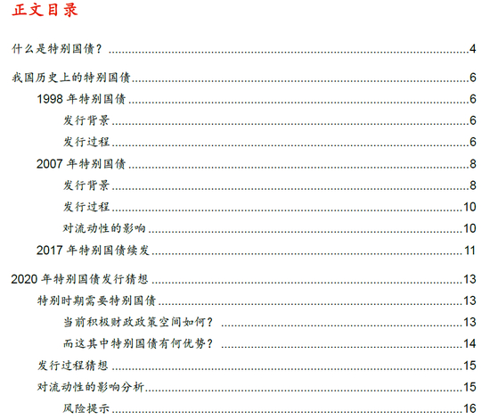 关键之年,宏观经济遭遇新冠疫情强力冲击,近期市场对特别国债的讨论开始增多。我国历史上进行过两次特别国债的新发,98年用于形成四大行资本金,07年用于购买外汇资产和形成中投公司股权。尽管我国积极财政政策尤其是中央杠杆率仍有空间,但特别国债具有诸多优势,适时、适度重启特别国债的发行有一定必要性。发行方式上,可采取财政部定向发行特别国债给商业银行,央行配合降准;央行借道政策性银行购买部分特别国债;支持银行永续债发行等方式。由于特别国债定向发行的可能性较大,公开发行预计央行货币政策也会配合,因此对流动性的影响预计有限。