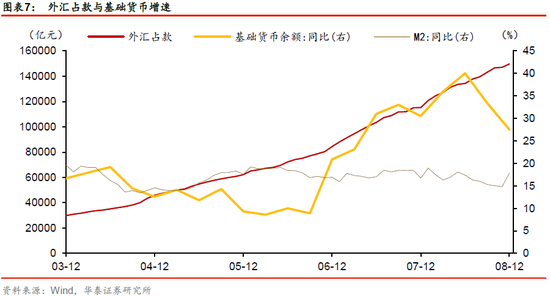 此外,外汇占款大幅流入带来基础货币迅速增加,M2增速持续超过目标增速。持续增加的外汇占款不断推高银行的超储率,通过商业银行的货币创造功能,以外汇资产为基础货币造成M2增速常年保持在15%以上,在2002到2007年间,M2增速平均高于两会目标值2-3%,从而造成国内流动性过剩,通货膨胀严重等问题,特别是在06年至07年这两年间,CPI当月同比曲线直线上升,峰值达到单月近3%。央行2007年7次提高准备金比例,5次加息,以抑制银行体系的信用创造过程。