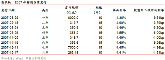 公开发行与非公开发行的考量:与前几次特别国债发行类似,为了避免对市场流动性形成过大冲击,大部分特别国债或采取定向发行的方式。但不排除小规模特别国债通过公开市场发行以确定利率标准。由于当前银行间流动性较为充裕,因此市场出资认购小规模特别国债也不会影响其资金备付,对其形成巨大的供给压力。此外类似2007年特别国债公开发行部分,被市场化机构持有的特别国债或具有二级市场流动性,因此无需基准发行利率的额外上浮,可减轻财政部发行成本。