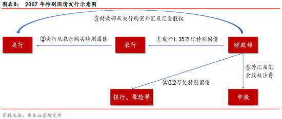 方式二,参照2007年特别国债的发行方式,可由央行借道政策性银行的方式购买部分特别国债。为了缓解特别国债对商业银行的供给压力,避免锁定大量流动性,参考2007年特别国债的发行经验,可由央行认购部分特别国债。操作上,由于央行不得直接在一级市场认购国债,所以此次预计仍需通过银行渠道使央行出资购买国债,由于国有大行均已上市,通过政策性银行的可能性更大。2007年央行借农行通道购买特别国债的部分原因在于农行还未上市,对于信息的披露还不严格,存在操作的可能性。但如今五大行均已上市,其他股份制商业银行欠缺相关的设施与条件,相较之下借助政策性银行通道的可能性更大。不过从2007年的经验来看,央行认购特别国债或需要消耗外汇资产,因此央行本次认购特别国债的规模可能较为有限。