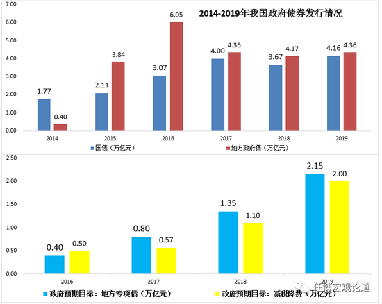 实际上从2014年以来的政府债券发行规模来看,近三年的国债发行规模均在4-4.50万亿之间,而地方政府债券发行规模自2015年才开始放量(2015年开始进行地方政府债务置换),考虑到2020年专项债发行规模将达到3.50万亿元以及地方政府隐性债务置换等因素,预计2020年国债和地方债券发行规模均将超过5万亿。主要理由如下: