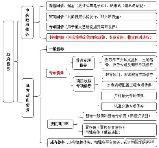中央政府国债可以分为普通国债、定向国债、专向国债和特别国债四类。定向国债是指专门向某些机构发行的国债,专向国债则主要是指用于基建等重大项目的国债,特别国债是为践行国家战略用途而发行的国债。其中特别国债也可以用来进行现券买卖、回购和质押交易,相当于丰富了央行的公开市场操作工具,需要提示的是虽然特别国债属于政府债务,但无需通过预算安排还本付息资金。
