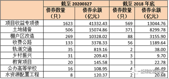 截至2020年3月27日,项目收益专项债券余额为4.13万亿元,较2018年的1.30万亿大幅增加232%。从具体分布来看,目前的专项债券仍然从具体规模上来看,目前的专项债券仍然主要集中于土地储备、棚户区改造、收费公路以及轨道交通等收益来源较为明确的领域,这四类领域的专项债券余额中比约为86%,其中土地储备、棚户区改造的规模合计占比则为60%左右。