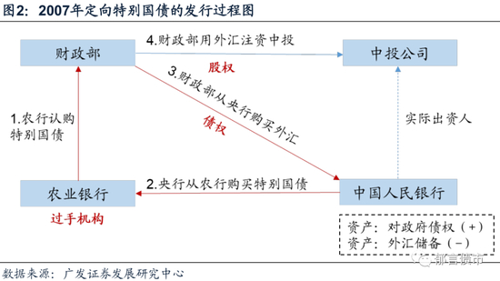 从发行过程来看,人民银行是事实上的出资人,而农行只是一个过手机构,这种操作规避了人民银行不能对财政透支的限制。首先,由农行购买财政部发行的特别国债,为了不对农行的资金头寸、资产负债及正常经营产生影响,在发行当天,人民银行就从农行全部买入此次发行的特别国债;紧接着,财政部用发行筹集的资金向人民银行购买等值外汇,从而完成对中投公司的注资,财政部成为中投公司的唯一股东,而人民银行是事实出资人。这一系列步骤最终表现为人民银行资产负债表上资产端结构的变化,即对中央政府债权增加,而外汇储备资产等额减少。