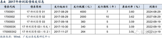 2017年:特别国债续发。2007年发行的约6963.78亿元特别国债于2017年8月、9月陆续到期,包括6000亿元定向特别国债和963.78亿公开发行的特别国债。为了保持适度稳定的流动性,在稳健中性的货币政策目标下,2017年8月29日财政部向境内商业银行定向续发6000亿元特别国债,第1期4000亿为7年期,第2期2000亿为10年期。