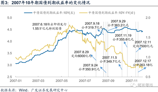 从发行结果来看,2007特别国债的发行对债市影响有限。2007年在通胀高企的背景下,央行紧缩的货币政策成为影响市场走势的主要因素。央行从年初开始共进行了10次上调存款准备金率的操作,每次上调0.5个百分点,存款准备金率从9.5%一路上升至14.5%。与此同时,央行又进行了6次加息操作,1年期法定存款利率从3.06%一直上调至4.41%。从图3可以看出,10年期国债供给的增加并没有带来其收益率的显著上行,从特别国债发行起始点8月份开始,其收益率基本在4.2%至4.5%之间上下波动。