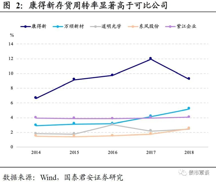 (1)存货占比不升反降,周转率异常高于可比公司。2014-2017年间,康得新的营业总收入年复合增长率达到22.66%,收入规模实现翻倍,作为生产高分子材料的制造业企业,康得新在规模扩张之际,归集原材料、产成品等的存货项目只有平均4.18%的增长率,且存货/总资产的比例也从2014年的4.55%降低至2017年的1.70%。比较同行业情况来看,万顺新材、道明光学、东风股份、紫江企业四家可比公司的周转率基本稳定在2.9%附近,近年来营运效率没有显著提升,但是康得新2017年的存货周转率却高达11.97%,不排除公司虚增收入、夸大盈利能力与营运效率的可能。